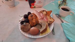 De middag begon met een zeer uitgebreide Brabantse koffietafel met allerlei soorten brood, kaas, gekookte eieren en vleeswaren, spareribs, gehaktballetjes enz. Ook was er volop fruit zoals kersen en aardbeien om van te smullen.